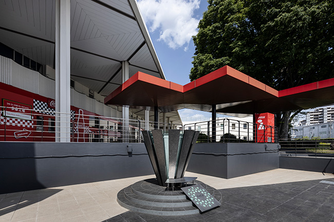 工場見学施設入口には、当社の前身となる12のボトラー社の先輩諸氏に感謝の意を表すためミュージアムの象徴となるモニュメントが設置されています。またモニュメントの前には銘版を設置し、銘版には各ボトラー社の名称を刻印したガラスを取り付けています。