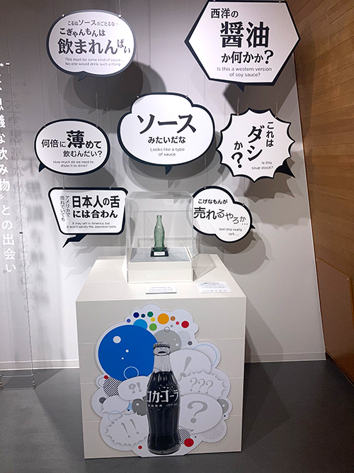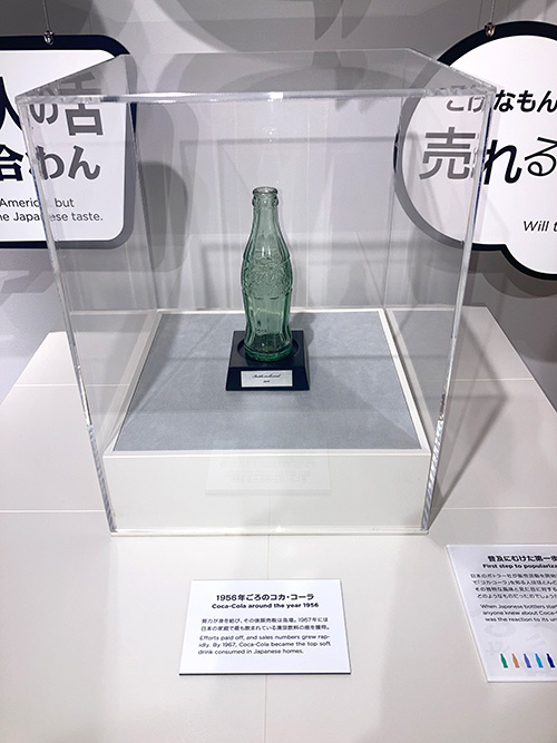 写真中央に写っているのは、日本で第1号のボトラー社が誕生した1956年頃の「コカ・コーラ」のコンツアーボトルです。輸入された醤油と間違われるなど、珍しい飲料を目にした人たちの感想とともに展示されています。