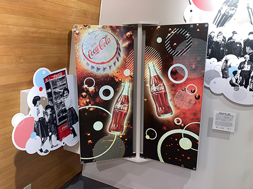 歴代の自動販売機やさまざまなデザインのラッピング自販機、各地域のシンボルとなる場所に掲出してきた屋外広告の写真の展示を通して、ボトラー社が地域密着で活動してきたことを紹介しています。