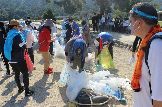 当日はお天気のなか109人が参加しました。検温や手の消毒を実施後、清掃を開始。宮島包ヶ浦自然公園には漁業系のごみや、発泡スチロールといったごみが多く見受けられ、今回の活動で63キログラムのごみが回収されました。