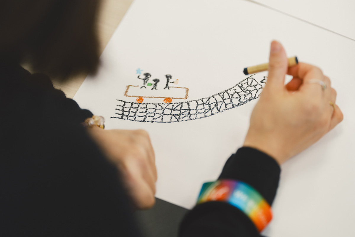 ワークは約30分という短い時間。初対面のメンバー同士で簡単な自己紹介を終え、すぐに協議がスタートしました。アライとして伝えたいメッセージを考えるなかで「性による区分をやめようということではないよね」「社員それぞれ、問題への理解度が異なるし、スピード感も違うはず。押し付けにならないようにしたい」など、アライが共有している想いを出し合いながらモチーフを考えていきます。まずはメッセージを文字にするグループ、とにかく手を動かしてみるグループなど、さまざまなスタイルでロゴデザイン案が練られていきました。