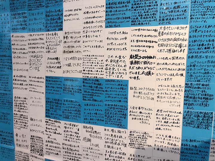 この「メッセージモザイクアート」は、花咲徳栄高等学校の生徒と教職員合わせて1,920名が、それぞれ1枚のメッセージカードに、感染症治療の最前線で働く医療従事者のみなさまへの想いを記し、そのカードを繋ぎ合わせて、大きな「感謝」という二文字のメッセージを作っています。