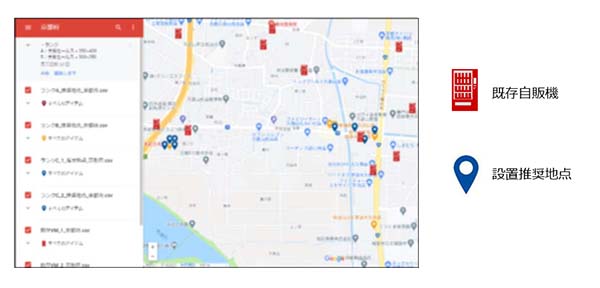 品揃えに加え、自動販売機の新規設置場所の候補地探しにも活用しています。どこに置き、どの製品を、いくら(価格)で販売すれば、どれだけの売上が立つのかといった予測モデルを作り、予測結果を地図上で参照できるシステムを構築しました。この予測結果が、これまで、担当者が全くターゲットとしていなかった場所を、新規設置場所の候補地として示したことがありました。実際に現地に行ってみると、近くにバイク店があり、予測結果が示した場所はバイク好きの若者が通る導線となっていました。地図の情報を見ているだけでは気づけないことを、データが見出した事例でした。