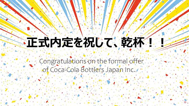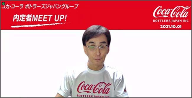 「数ある企業の中からコカ・コーラ ボトラーズジャパングループへの入社を決め、本日の内定式に参加していただいたことに御礼申し上げます。来年4月にみなさんがコカ・コーラ ボトラーズジャパングループの一員になることを大変嬉しく思います。