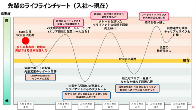 最初は、少人数のグループにわかれて「先輩社員キャリア分析ワーク」の課題に取り組みます。先輩社員に入社から現在に至るまでのキャリアや私生活におけるターニングポイントをヒアリングし、ライフラインチャートを作成しました。