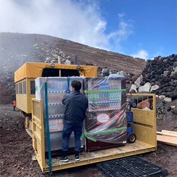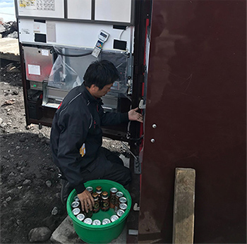 毎年、登山シーズンを迎える7月になると、自動販売機を業務用のブルドーザーで山頂に運搬します。営業の社員も一緒に乗り込み、片道約2時間かけて山道を登ります。山頂に到着すると、営業社員が設置工事を開始し、8月中旬から下旬頃に撤去作業を行っています。