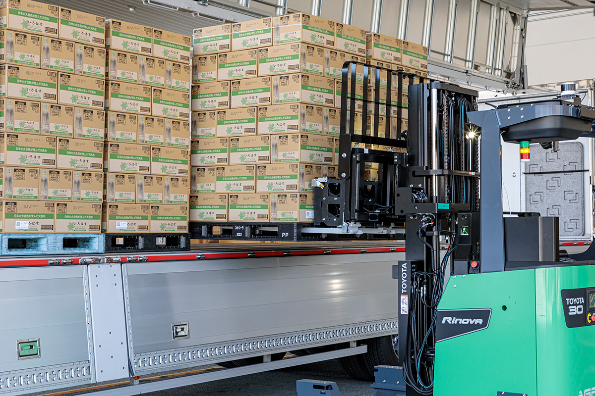 そのようななか、東日本エリア全域の「い・ろ・は・す」の製造・供給を担う白州工場倉庫(山梨県北杜市)では、株式会社豊田自動織機が開発する「4本フォークタイプのトラック荷役対応自動運転フォークリフト[3]」を導入し、2024年9月より実証実験が始まりました。