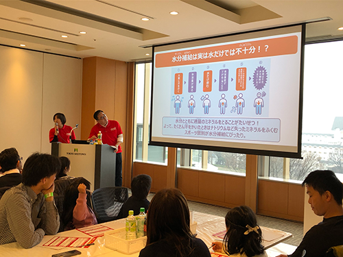 近年増加している熱中症の予防啓発のため、当社は学校や各種団体・企業のみなさまを対象に水分補給セミナーを実施しています。当セミナーでは、日常生活やさまざまなシーンにおける正しい水分補給の方法、水分とミネラルの補給の重要性や熱中症対策のポイントなどをわかりやすくお伝えしています。