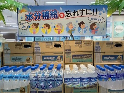 当社では、製品と一緒にポスターを掲示し、水分補給の重要性をお伝えできるよう売り場づくりを展開しています。