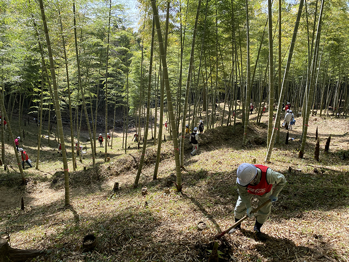 当日は晴天に恵まれた美しい森林の中で、当社社員や家族、市民ボランティアなど総勢70名が参加し、竹林整備やタケノコ収穫を体験いたしました。