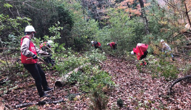 今回の開催は平日のため、主に当社の明石工場に勤務する社員と家族が参加。イベントでは、除伐、土留(どど)め、防護柵の設置を実施しました。除伐とは育成途中の幼齢木を守るために、その他の樹木を刈り払う作業です。除伐をすることで、樹木はまっすぐにすくすくと育つことができます。