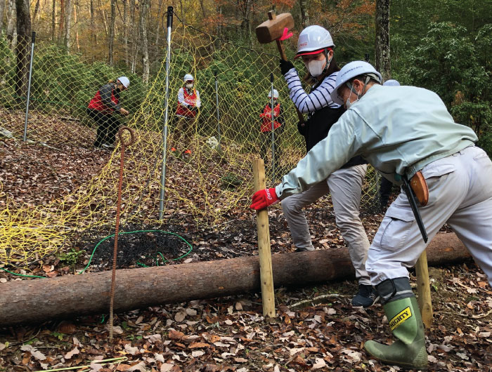 除伐が終わった後は、土留めの作業。土留めの一番の役割は土砂崩れの防止です。最後に今回作業を行った場所の周辺に防護柵を張りました。これは野生動物、この地域では特に鹿による食害などから森林を守るために設置しています。柵の下から潜り込まれないようネットの裾に留め具を打ち込みました。