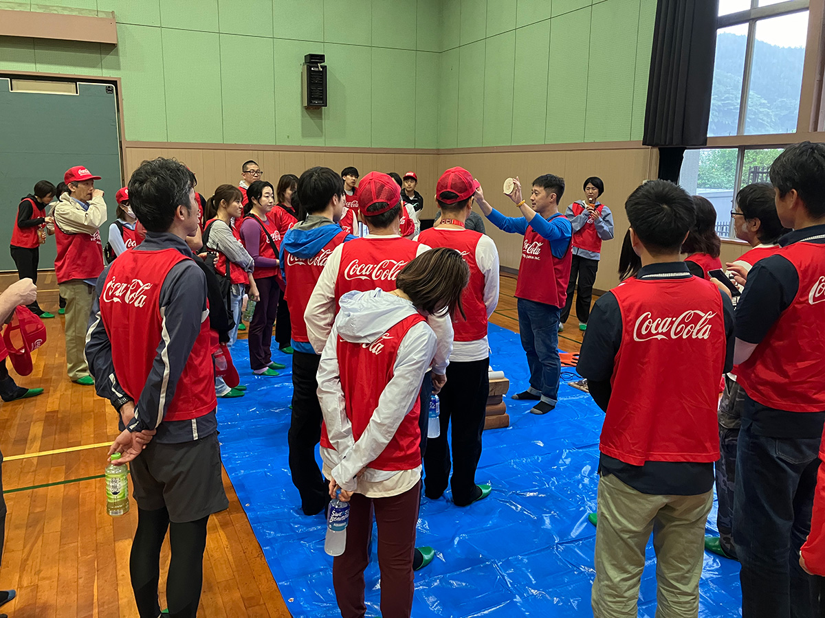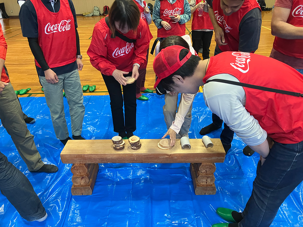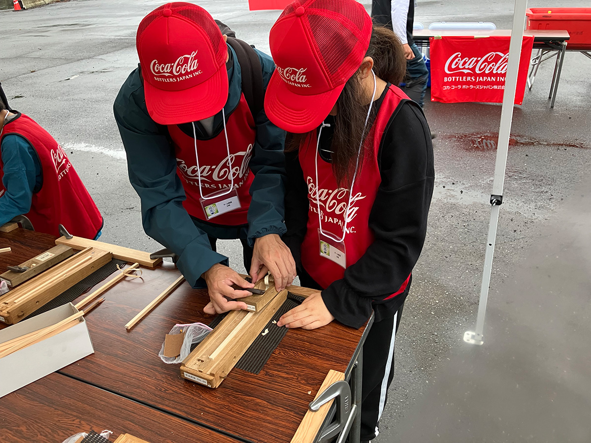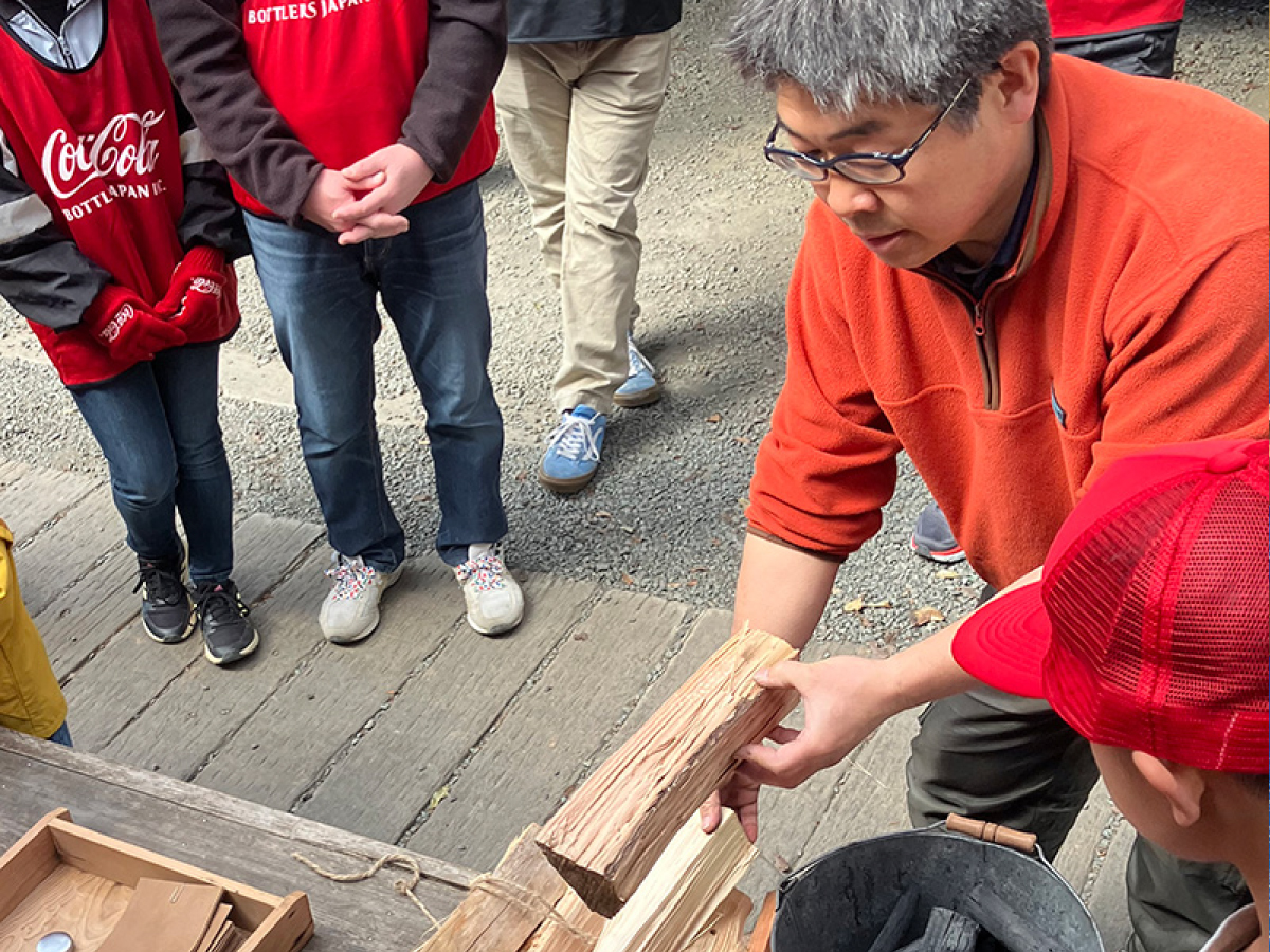 2024年6月21日、当社多摩工場の周辺流域、八王子市で初開催となりました。八王子市と締結した協定( https://www.ccbji.co.jp/news/detail.php?id=1425 )に基づくもので、同市上川町の「上川の里特別緑地保全地区」で開催しました。当日参加したのは、当社社員、日本コカ·コーラ社員など75名。間伐や地ごしらえ、枝打ちといった森林整備作業を体験する予定でしたが、残念ながら大雨のため、屋内での間伐材を使った木工作(コースターづくり)や、年間の森林整備を委託しているNPO法人 森のライフスタイル研究所が講師となった、水資源保全に関する講座等で森林の役割について学んでいただきました。