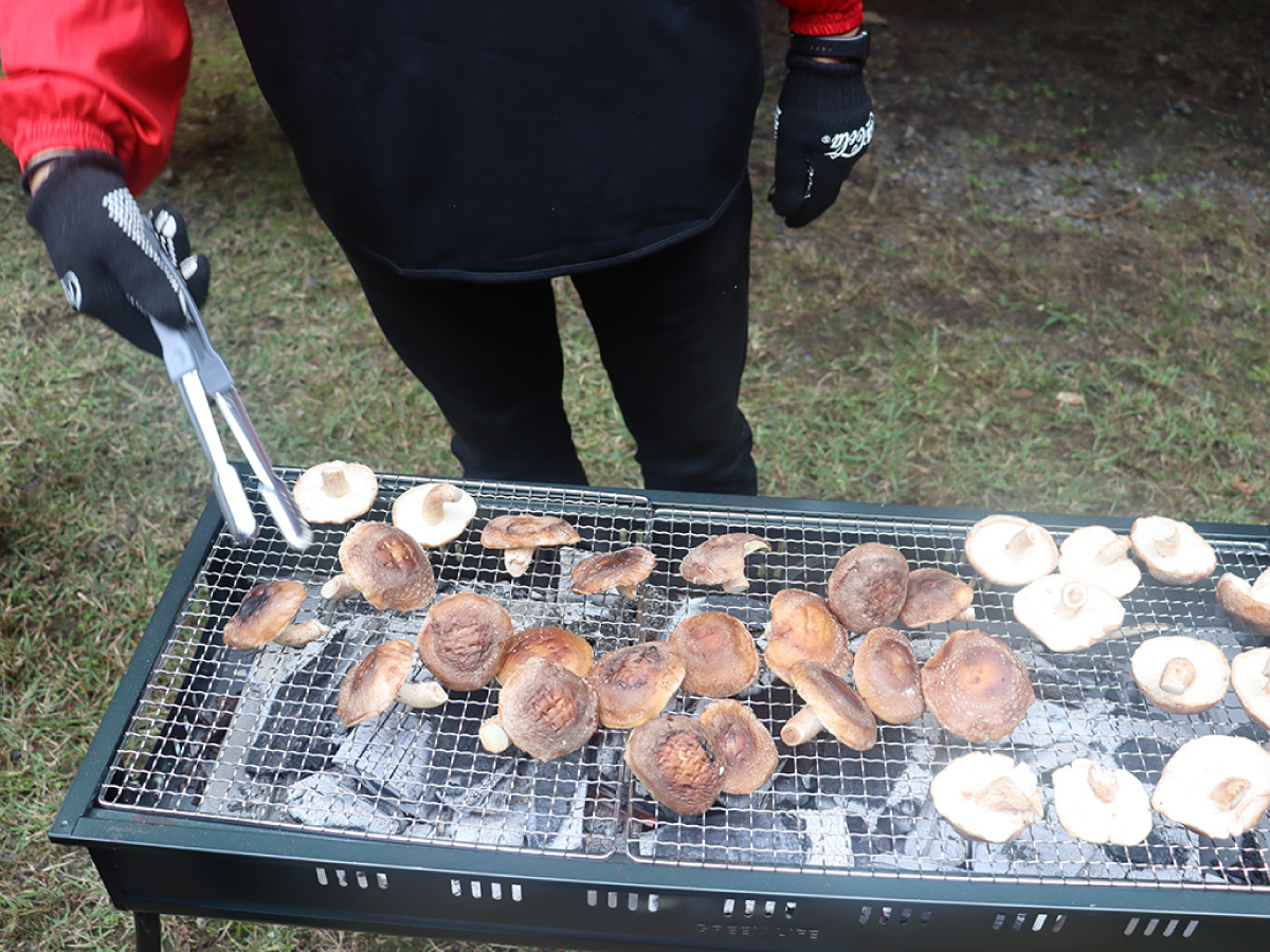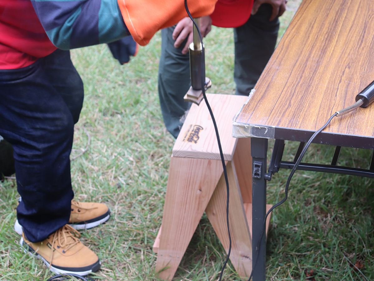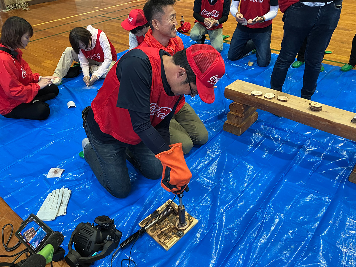 京都工場および周辺オフィスの社員とご家族など、47名が参加し、間伐や下草刈りなどの林業体験を行いました。木工作では、間伐材を使った椅子の制作に取り組みました。焼きゴテで、好きな模様の焼き印をつけ、自分だけのオリジナルの椅子づくりを楽しんだほか、お昼には開催地である宇治田原町の特産しいたけのBBQも振舞い、森の恵みを味わっていただきました。