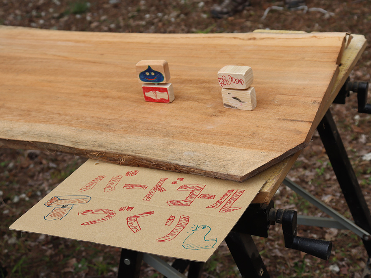 白州工場および周辺オフィスの社員とご家族、北杜市民のみなさまなど、56名が参加し、枝打ちや土留めづくりを体験したほか、間伐材を活用したバードコールづくりにチャレンジしました。バードコールは、鳥の鳴き声に似た音を出す道具で、ブナ、ケヤキ、ナラ、サクラなどの木片に穴をあけ、穴にねじ込んだボルトを回すと、金属と木がこすれあって「キュッキュ」という小鳥のさえずりに似た音がでます。作ったバードコールをみんなで鳴らし、鳥の鳴き返しを楽しんでいただきました。