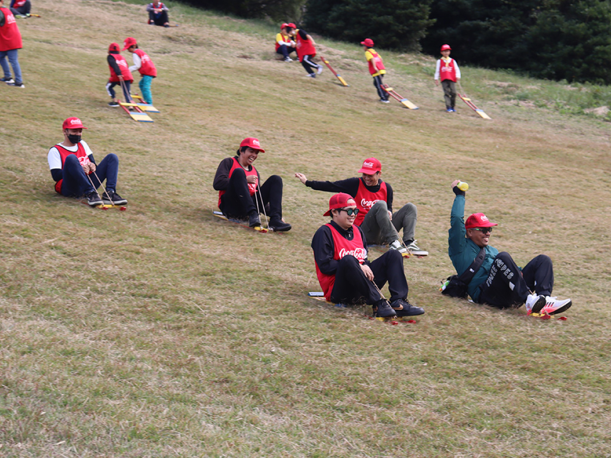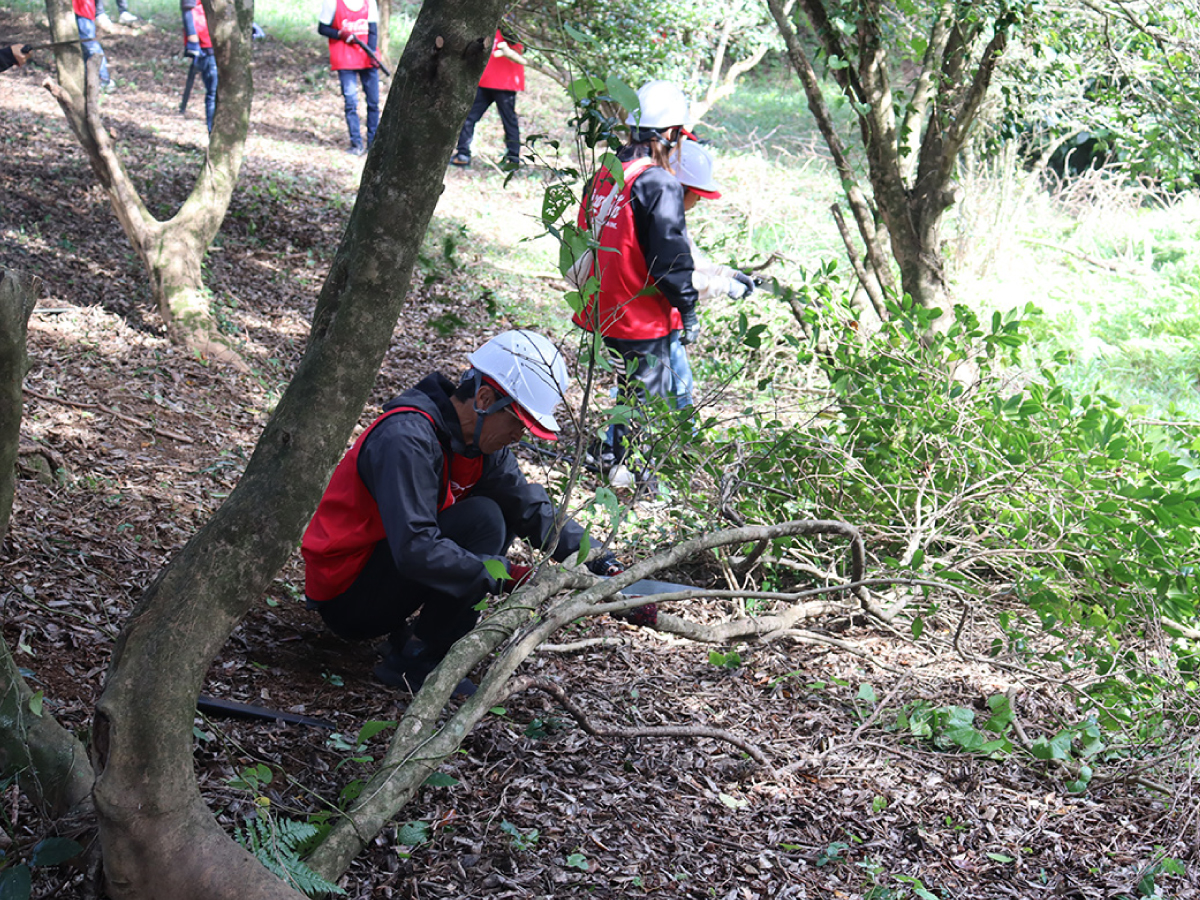 基山工場、鳥栖工場および周辺オフィスの社員とご家族、基山町民のみなさまなど79名が参加し、枝打ちなどの林業体験や、木工作などを行いました。会場となったのは、基山草スキー場。近くには、基肄城(きいじょう)跡もあり、休憩の合間には、草スキーや歴史散策をお楽しみいただきました。