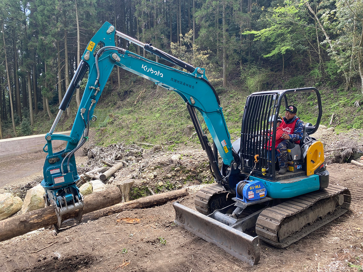 えびの工場および周辺オフィスの社員とご家族、えびの市民のみなさまなど131名が参加し、タケノコ収穫やチェーンソーによる丸太輪切り体験、林業重機操作体験を行いました。