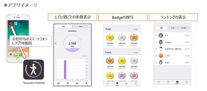 歩いた歩数と目標達成率が1日および1週間単位で表示される自社開発の当社オリジナルアプリを社員に付与しているスマートフォンに配信。アプリでは、歩数の平均値により上位社員をランキング表示する機能に加え、同僚と対面で話す機会が減っている中、コミュニケーション醸成に繋がるよう、所属部署や支店などで編成するチームで参加できる団体戦のランキングを表示する機能も備えています。