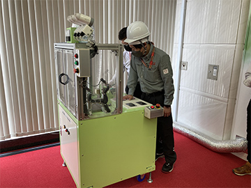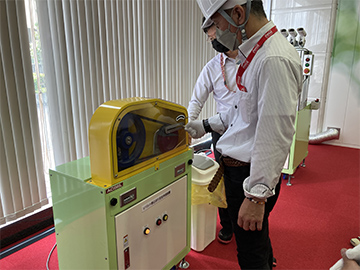 その後、「体感トレーニング」では、ローラーやシャフト、ベルトなどの回転物による巻込まれ事故の模擬体験や、感電模擬体験を、安全体感機を使用して学びます。