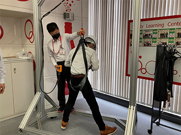 墜落制止用器具の正しい着用を学ぶ吊り下がり体験