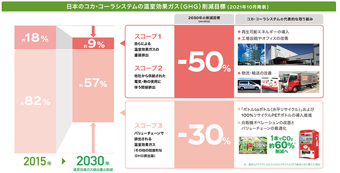 2021年10月、日本のコカ・コーラシステムは、日本国内のバリューチェーン全体における温室効果ガス(GHG)を2030 年までにスコープ1、2において50%、スコープ3において30%(いずれも2015年比)削減することを目指す目標を策定しました。日本政府の掲げる温室効果ガス削減目標(2030年度の排出量を2013年度比で46%削減)の達成にも積極的に貢献していきます。詳しくはこちら