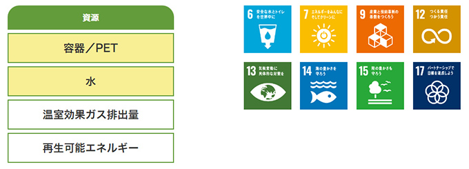 私たちは、日本のコカ・コーラシステムの「サスティナビリティーフレームワーク」における3つのプラットフォーム「多様性の尊重」「地域社会」「資源」に基づき、より具体的な非財務目標「CSV Goals」を定め、持続可能な事業と社会、そしてミッション の実現に向けて取り組みを進めています。また、各プラットフォームにおけるSDGsとの関わりを検証し、SDGsの達成も目指すことで、社会課題の解決に貢献します。