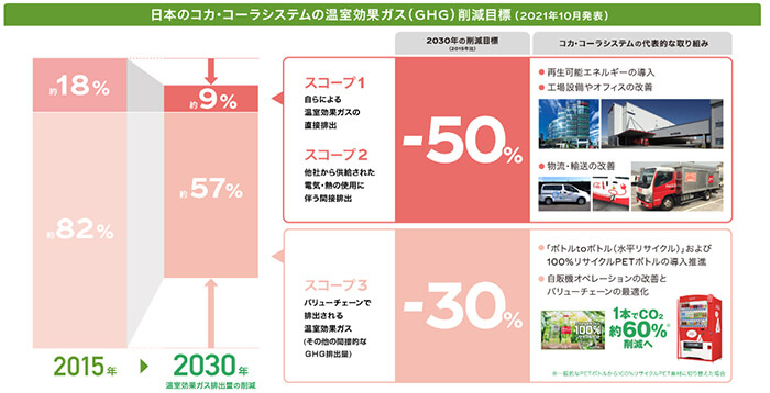 日本のコカ・コーラシステムは、パリ協定ならびに科学的根拠 に基づくGHG排出量削減目標に沿って、サプライチェーン全体 のGHG排出量削減に取り組んでおり、2050年までにGHG排出 量実質ゼロの達成を目指しています。当社は、中期非財務目標 「CSV Goals」として、日本国内のバリューチェーン全体における GHG排出量を2015年比で、2030年までにスコープ1、2に おいて50%、スコープ3において30%削減することを目指す目 標を策定し、さまざまな取り組みを実施しています。