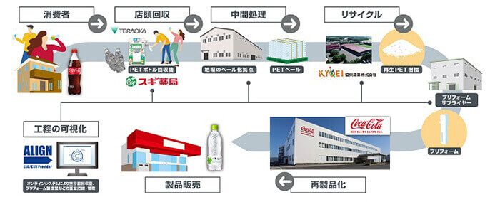 オフィスビルを所有・管理する三菱地所株式会社と協業し、オフィス共有部から回収した使用済みPETボトルの「ボトルtoボトル」の仕組みを構築したり、店頭で回収した使用済みPETボトルを「ボトルtoボトル」にする取り組みをスギ薬局などと行っています。