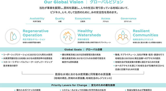水は、私たちの製品の多くに含まれる最初の成分であると同時に、私たちの事業の持続可能性や地域社会の衛生にとっても中心的な役割を担うものです。2021年3月、ザ コカ・コーラ カンパニーは2030年に向けた新たな水資源保全戦略のグローバルフレームワークを発表しました。新たな戦略においては、地域の水源涵養、より厳格なポリシーの提唱、事業と地域社会における責任ある水の利用などを通じ、持続可能な水資源の保全に力点を置いています。