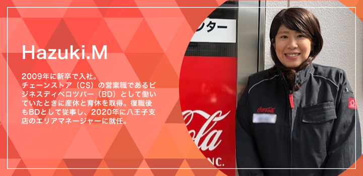 2009年に新卒でコカ・コーラ ボトラーズジャパンの前身である東京コカ・コーラボトリングに入社しました。CSのマーチャンダイザー(MD)を経て営業職であるBDとなりました。BDとして働いていたときに出産を経験。2020年8月に管理職であるエリアマネージャーに昇進し、現在はCS八王子支店で、チームマネジメントとエリアのスーパーマーケットや、ドラッグストア、ディスカウントストアへの営業活動をメインに行っています。支店に所属しているのは私も含めて9名。男女の比率は5:4で年齢が若いメンバーが多いですが、私の業務をサポートしてくれるベテランもいるチームです。