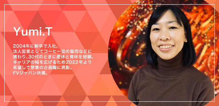 20~30代前半くらいは目の前の仕事に全力で取り組んでいました。主にコーヒーを扱っていたので、コーヒーに関する知識を得るためにセミナーに参加したり、資格を取得したり。また、ハンドドリップの大会に出るなど、自己研鑽に励んでいました。昨年あたりから、法人営業の仕事に対して充実感を得ているなあと思ったことや、女性社員を対象に”リーダーとしてありたい自分の軸を見つけ、一歩を踏み出すこと”を目的として開かれた「Female Next Leaders Program」という研修に参加し、多くの方の意見や考えを聞いたことが刺激となり、キャリアを再検討しました。挑戦することに年齢はあまり関係ないと思います。むしろ、経験を積んでいるからこそ見えているものもある。当時の上長に相談したところ、ちょうど今の部署が新設されたので異動することになりました。