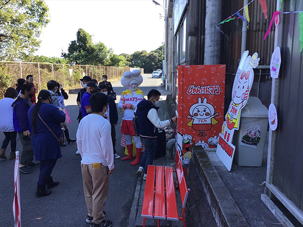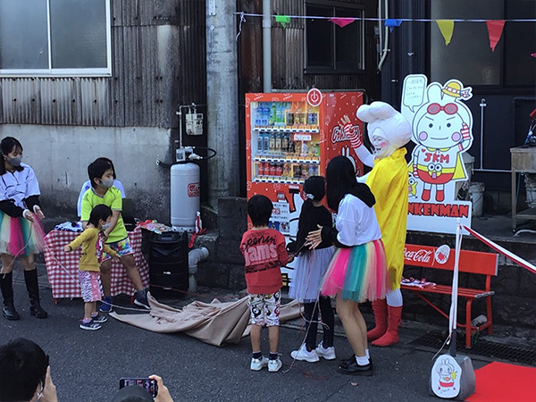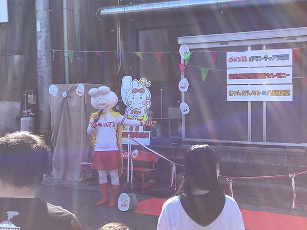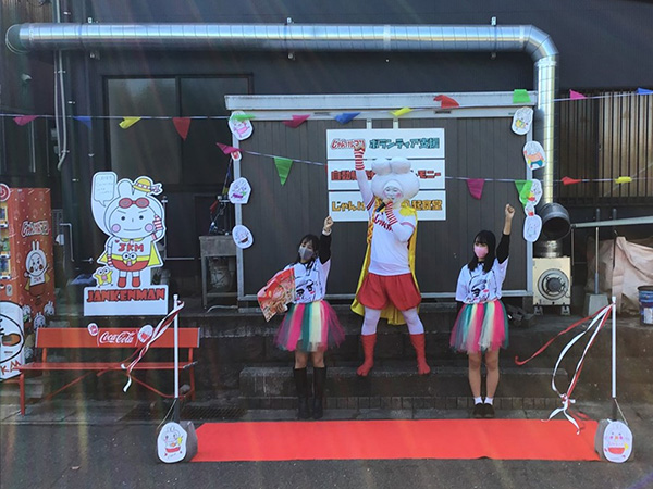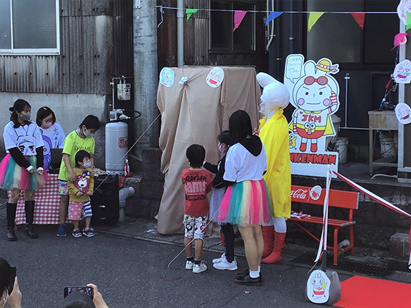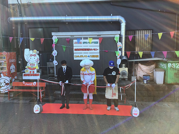 11月14日(土)には、第1号機の除幕式が行われ、当社の鹿児島支店長の宮森が出席し、「じゃんけんマン」と設置先である八起食堂の店主とともに、テープカットを行いました。