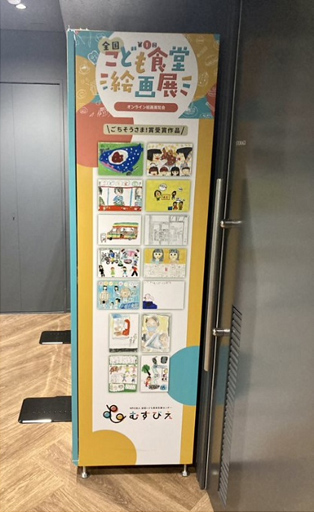 ポスターには「むすびえ」のビジョンが記されています本支援自販機横に設置されている空容器回収ボックスには、むすびえが昨年主催した第1回「全国こども食堂絵画展」で「ごちそうさま!賞」を受賞した27作品がプリントされています。