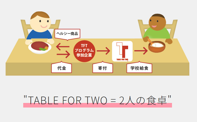 TABLE FOR TWO International (TFT)は、世界規模で起きている、飢餓と肥満という食の不均衡を解消し、開発途上国と先進国両方の人々の健康を同時に改善することをミッションに活動しています。そのソリューションのひとつがTFTプログラムです。