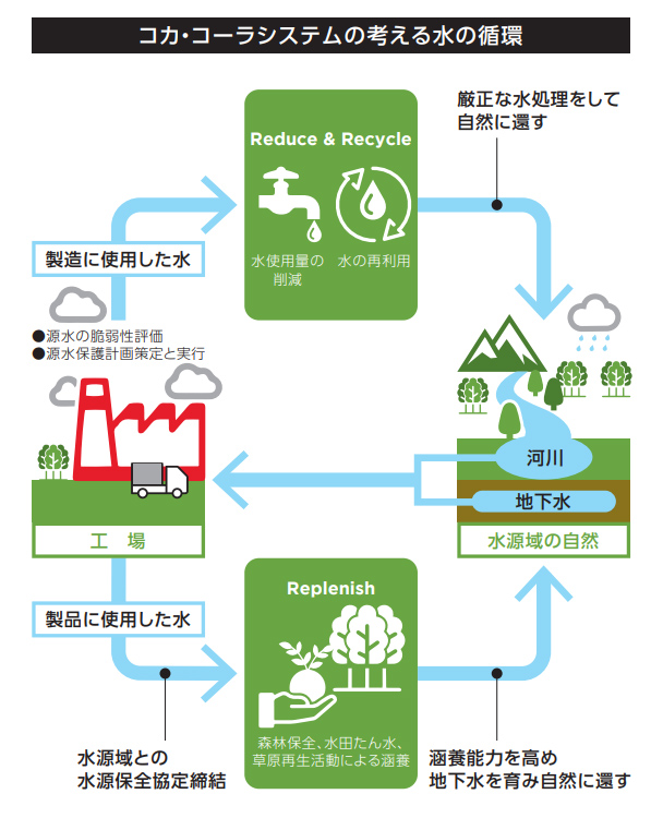 日本のコカ・コーラシステムは、製品に使用した量と同等の水を自然界に還元する取り組みを推進しています。具体的には、製造過程における水使用量の削減(Reduce リデュース)、製造過程で使用する水の再利用(Recycle リサイクル)、製品に使用する水を自然に還元する地域の水源涵養(Replenish リプレニッシュ)を軸とした活動を展開しています。