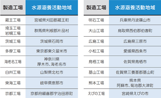 一方「製品になる水」は、地域のみなさまと協力し、植林、間伐といった森林保全活動などを通じて水源の涵養能力を高め、豊富な地下水を育むことで自然界へ還元しています。