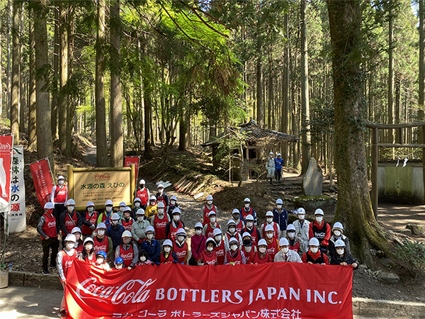 水資源保護活動として実施しているのが、コカ・コーラ「森に学ぼう」プロジェクトです。コカ・コーラ「森に学ぼう」プロジェクトは、環境保護・環境教育のプログラムで、森林保全のための間伐や植林、木工体験、ネイチャープログラムなどを体験する中で、森や生きものと触れ合いながら、「自然や水の大切さ」や「人と自然のかかわり」、「環境保護の意義」を理解していただくことを目的としています。新型コロナウイルス感染拡大防止のため休止していましたが、2022年4月に、約3年ぶりにえびの工場の水源域において、えびの市民ボランティアや社員が協働で森林保全活動を実施しました。