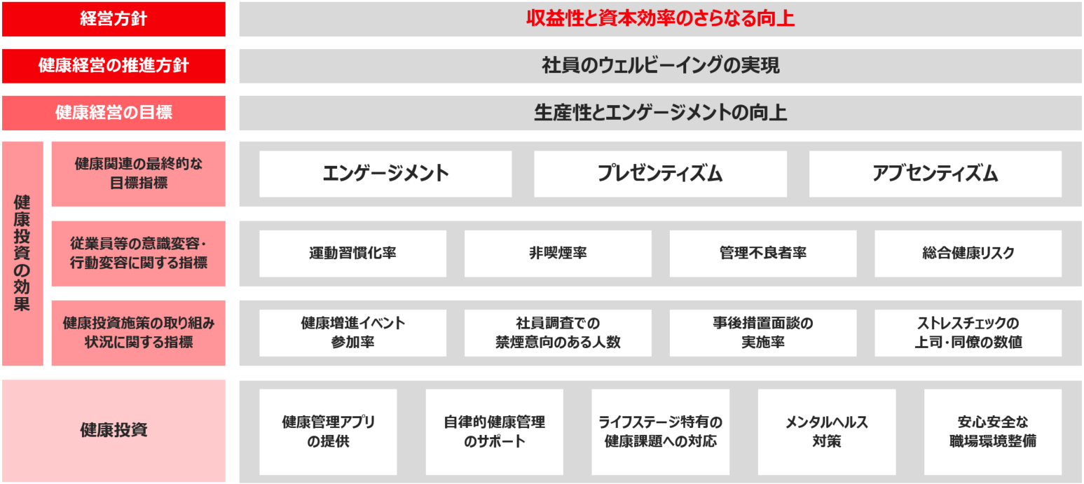 これを実現するために、私たちは社員のウェルビーイングを経営戦略に紐づく重要な課題と位置づけ、「安全と健康はすべてに優先する」という方針のもと、社員が心身ともに安全で健康的に働ける環境を整え、生産性とエンゲージメントの向上に取り組んでいきます。
