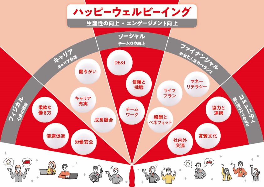 社員と組織のウェルビーイング向上を実現するために、こころとからだの健康と、はたらきやすい職場環境の両面から取り組みを進めています。